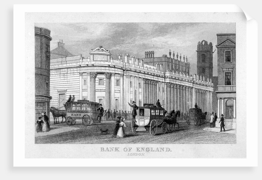 View of the Bank of England and Princes Street View of the Bank of England from Lothbury court, City of London, 1827; with a street scene and horse-drawn vehicles.