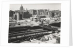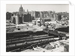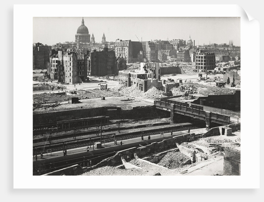 The Barbican area of the City of London, World War II, 1942. View showing the devastation following the demolition of unsafe buildings damaged by German bombing. Amongst the rubble people can be seen standing on the station platform waiting to catch a train.