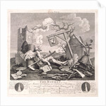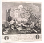 'The Bathos', 1764; showing Time expiring, collapsed against a broken column, with the blade of his scythe snapped and his hour glass smashed, blowing out smoke from his broken pipe. Next to him is a sign for 'The World's End' and the ground is littered with various broken objects.