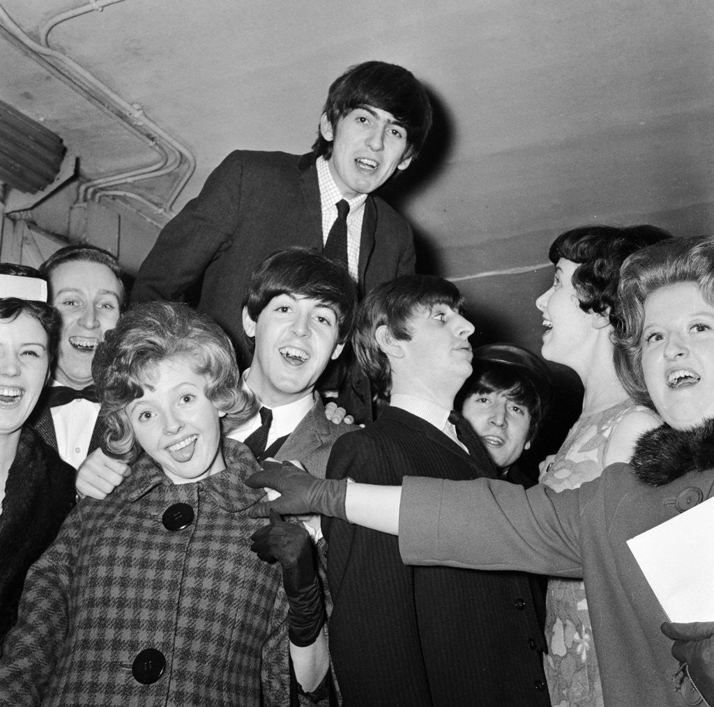 Meet The Beatles Competition Winners, run by the Sunday Mirror Newspaper, meet with The Beatles backstage at the Olympia Theatre, Paris, France, during the groups residency (16th January - 4th February), pictured Monday 3rd February 1964. George Harrison, Paul McCartney, Ringo Starr, John Lennon.