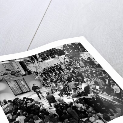 The Beatles appearing on the television Show 'Around the Beatles' 6 May 1964. Performing left to right on stage: John Lennon, Ringo Starr (back view), Paul McCartney, and George Harrison.