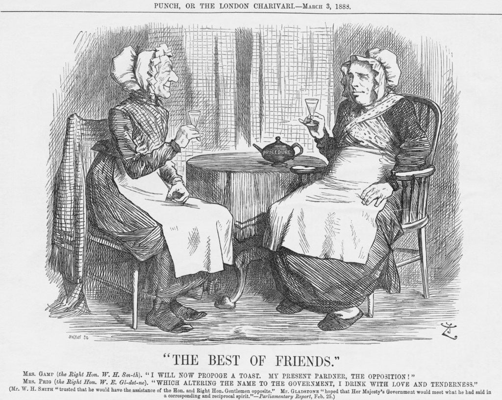 The Best of Friends, 1888. The Liberal Leader of the Opposition, Mr Gladstone (left), takes a drink with Mr WH Smith from the Conservative Party. There had been evidence of a new spirit of cooperation during a recent parliamentary debate. From Punch, or the London Charivari, March 3, 1888.