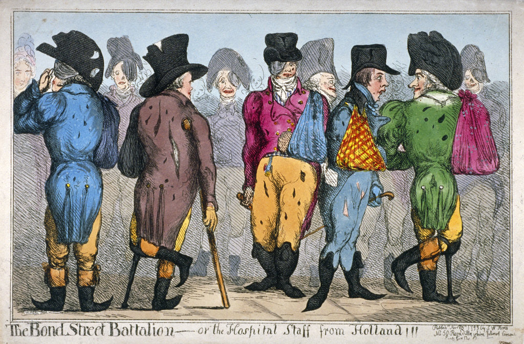 'The Bond Street battalion - or hospital staff from Holland!!!', 1799. Town fops feigning wounds (which had become fashionable on the return of the Guards from Holland). The figures includ Lumley Skeffington, John Penn and Lord Kirkcudbright.