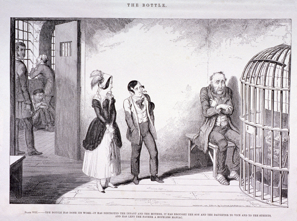 'The Bottle', 1847; showing the interior of a prison with the daughter and son visiting their father. Due to the effects of excessive alcohol consumption the mother and youngest child have already died, the daughter and son have been living a life of vice on the streets and the father has become a maniac.