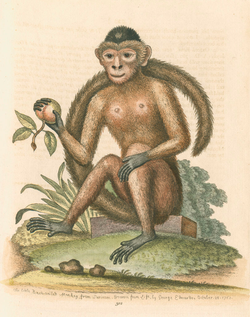 Zoological study of a monkey, possibly a tufted capuchin Sapajus apella, although Edwards identifies the animal as being from Surinam. The monkey is shown seated on a stone slab and holding fruit. Plate 312 from chapter 102 of Gleanings of natural history, exhibiting figures of quadrupeds, birds, insects, plants, &c..., by George Edwards, volume 3 (London, for the author, 1764). The plate is inscribed: 'The little Bush-tailed Monkey, from Surinam. Drawn from Life, by George Edwards, October 28 1761.'