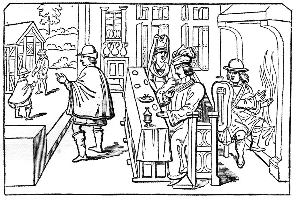 The bycocket, c1470, (1910). Thr domed top of the bycocket (peaked cap) is shown in modified form. The man on the right has a hurdy-gurdy, a type of musical instrument. Illustration from British Costume during 19 Centuries by Mrs Charles H Ashdown, (London, 1910).