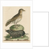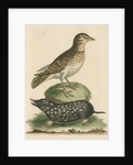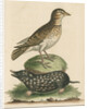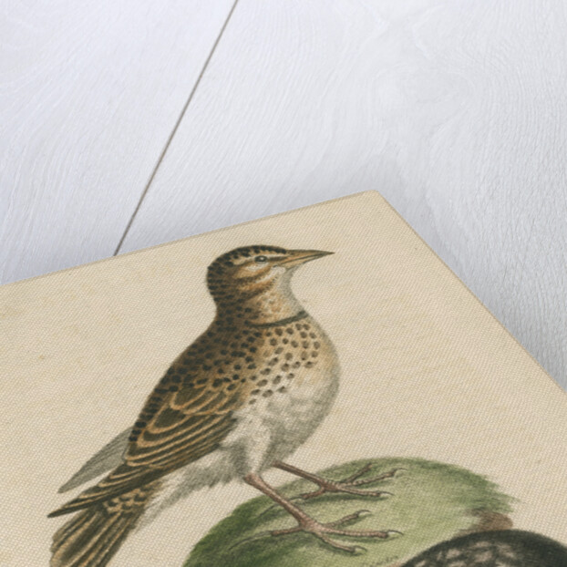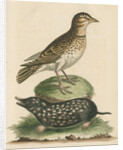 Zoological studies of a 'Calandra' from North America [possibly the female Horned lark Eremophila alpestris] posed on a turf divot, with a British mole Talpa europaea. Plate 268 from chapter 58 of Gleanings of natural history, exhibiting figures of quadrupeds, birds, insects, plants, &c..., by George Edwards, volume 2 (London, for the author, 1760).