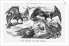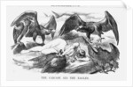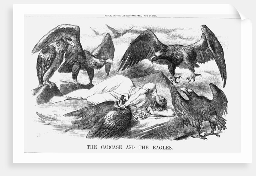 'The Carcase and the Eagles', 1871.The dead body of France lies outstretched, one hand holding down the wounded Eagle of Communism. All around, the other eagles circle in search of filling the power vacuum. They represent the Royal House of Bourbon, Imperialism, Republicanism and Monarchy. France had in the past been ruled by all of these eagles, but following her unsuccessful war against Prussia, and the subsequent short anarchy of Communism, she now had no real ruler. From Punch, or the London Charivari, June 17, 1871.