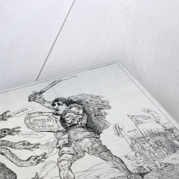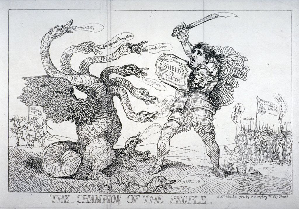 'The champion of the people', 1784. Charles James Fox attacking a many-headed monster, raising the Sword of Justice above his head. Behind him are his supporters, English, Irish and Indians.