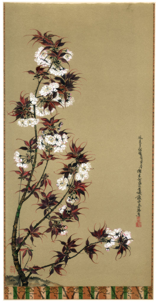 'The Cherry Blossoms of Mikawa', 19th century (1886). Shijo School. From a painting on silk by Ota Kinkin, Shijo School. Found in the collection of the British Museum. A print from The Pictorial Arts of Japan, by William Anderson, Sampson Low, Marston, Searle, & Rivington, London, 1886.