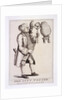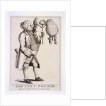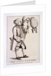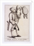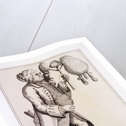 'The City Tonsor', 1771. A corpulent man is holding three wigs on a stand; the one on the right is like that worn by macaronis.
