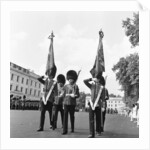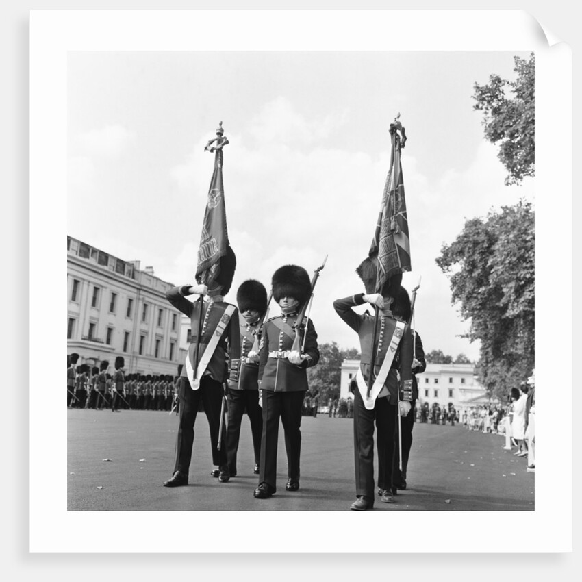 The Coldstream guards seen here parading the regimental colours and battle honours at Chelsea Barrack on the last day they mounted the guard at Buckingham Palace with the old .303 Enfield rifles.