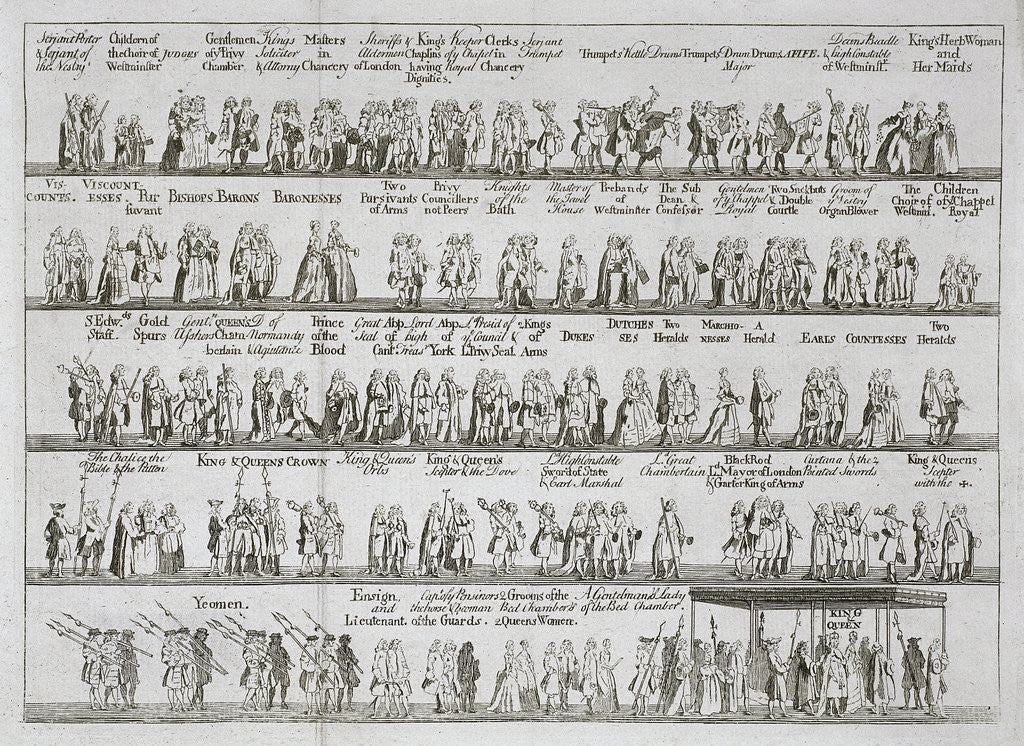 The coronation procession of King George II, October 1727, (c1727). The various members of the royal procession are shown in five strips with text identifying them. The king, bottom right, leads the procession, walking with the queen under a canopy held over him. Lords and ladies-in-waiting, yeomen, footmen, courtiers and others including the Lord Mayor of London, Sir John Eyles, follow behind.