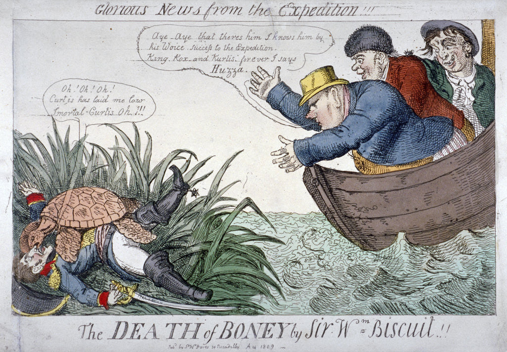 'The Death of Boney by Sir Wm Biscuit!', 1809. Above the image are the words Glorious news from the expedition!!!; showing Sir William Curtis leaning from a small open boat towards the shore, where a turtle is attacking Napoleon.