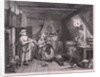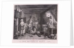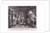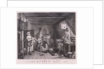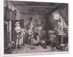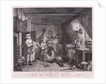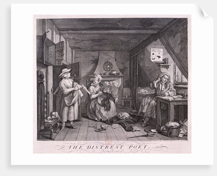'The Distressed Poet', 1740; a poor poet, at work in his garret, is interrupted by a milkmaid demanding payment. Third and final state of plate. One of a set of six plates.