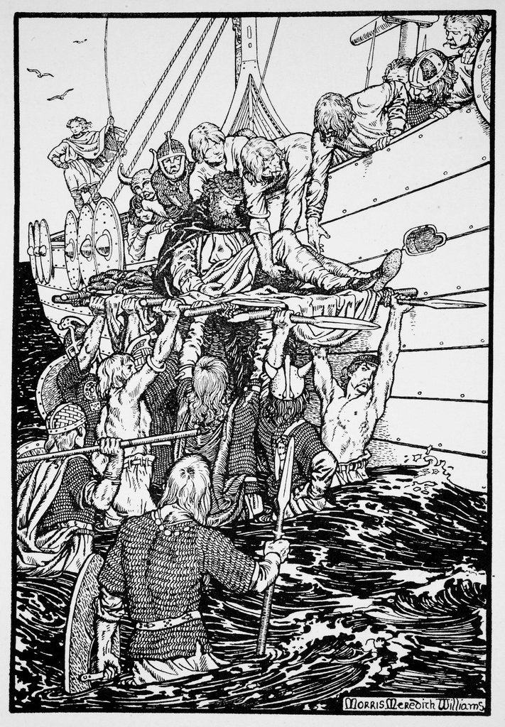 The dying King Haakon carried to his ship, 961 (1913). King Haakon I (Haakon the Good) (c920-961) of Norway was mortally wounded at the Battle of Fitjar in 961. Illustration from The Northmen in Britain by Eleanor Means Hull, published 1913.