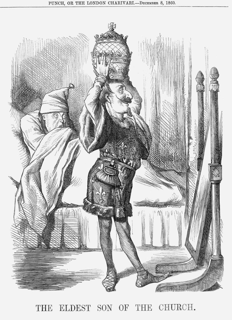 'The Eldest Son of the Church', 1860. This cartoon shows Pope Pius IX staring out over the bedclothes at the French Emperor, Napoleon III, who is trying the Papal Crown for size in front of the bedroom mirror. During the past couple of years, both France and Italy had gained some of the territories previously held by the Pope and the Catholic Church. This cartoon takes a little look at the possibility of Napoleon becoming the next pope. However, the accompanying little piece of text dismisses the possibility. Why, Punch asks, can the Emperor of the French never be Pope? Because, according to Punch, by the simple fact it is impossible three crowns can ever make one Napoleon. Crowns and (Louis) Napoleon are both references to coins of the two countries. From Punch, or the London Charivari, December 8, 1860.