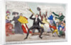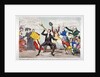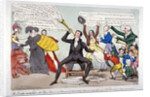 'The exile restored or the spies, spawns & spewers of scurrility abuse & defamation set to work', 1820. Sir John Stoddart sitting on a chair, blowing a blast of abuse through a trumpet at Queen Caroline who appears on the left, protected by Alderman Matthew Wood; newsboys shout and blow trumpets on the right.