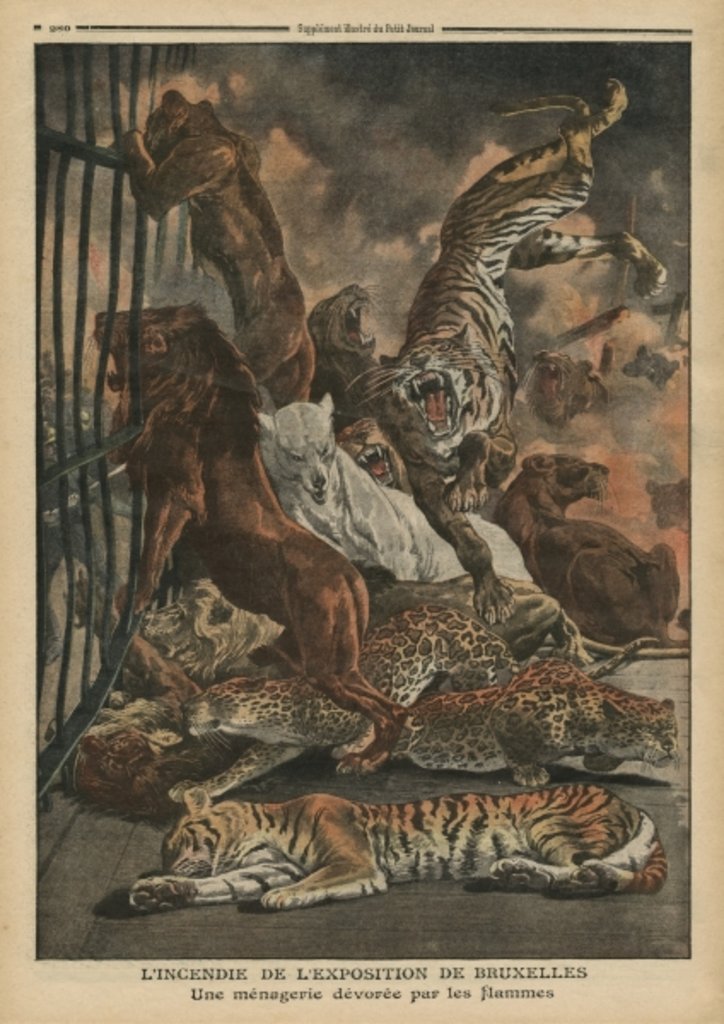 The fire at the Universal Exhibition of Brussels, a menagerie being consumed by the flames