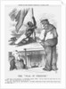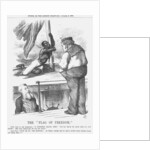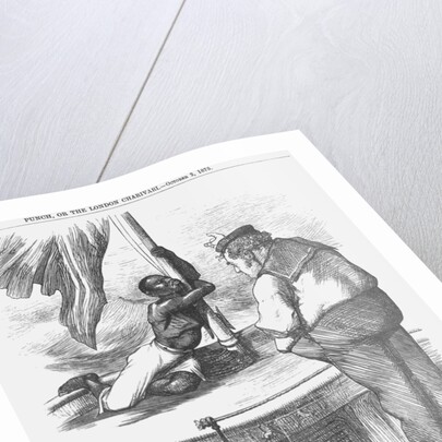 'The Flag of Freedom', 1875. An escaped slave clings to Britain's flagpole as John Bull argues the toss with the First Lord of the Admiralty, G Ward Hunt. Authority states that the slave should be handed over. John Bull, that stalwart representative of the British people refuses. This relates to the 'Slave Circular' which had been occupying press and government. The Admiralty had issued blanket instructions that stated that escaped slaves should either be refused asylum, or, if picked up at sea, should be handed over at the nearest port. Public outrage was loudly expressed as it had always been a point of honour that escaped slaves should be able to claim the protection of the British Flag. The instruction was withdrawn. From Punch, or the London Charivari, October 2, 1875.