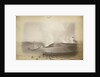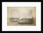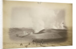 Landscape with steam clouds billowing in the middle distance and five members of Percy Smith's surveying team in the foreground, facing away from camera. Two of the expedition members carry long staffs and there is a pack on the ground behind them. Print marked '45' top centre. The print is embossed 'Charles Spencer, photographer'.