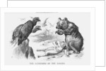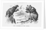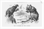 'The Gathering of the Eagles', 1877. The Russian Bear licks a cut on its paw, as Turkey lies wounded on the ground. Gathering around are the two-headed eagles representing Germany and Austria. On the 10th December 1877, Turkey surrendered to Russia. On the 14th December, Serbia declared war against Turkey. The Russian Bear had weakened Turkey to the point where she was easy prey. Britain had remained neutral and Punch was now advocating some action: 'will the Lion that has kept aloof/Bestir himself at length in Right's behoof?'. From Punch, or the London Charivari, December 22, 1877.