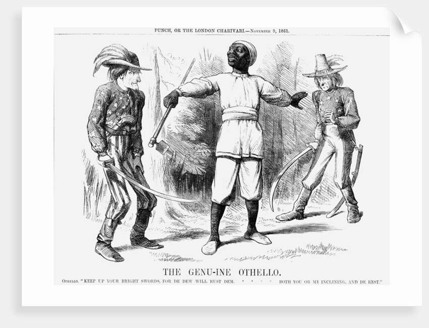 'The Genu-ine Othello', 1861. In this cartoon, the slave is depicted as the real Othello quoting an approximation of a couplet from Shakespeare's play. He has been given a speaking style which shows the contemporary attitude to blacks. On the left of the slave is President Lincoln and on the right is President Davis. Both men are armed with long swords as they prepare for a fight to the death, but 'Othello' instructs them to put up their swords. From Punch, or the London Charivari, November 9, 1861.