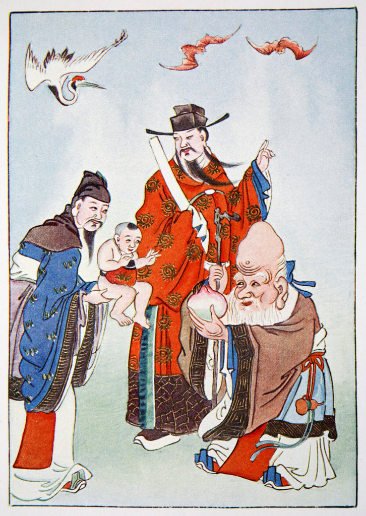 The Gods of Happiness, Office and Longevity, 1922. From Myths and Legends of China, by Edward TC Werner, published by George G Harrap & Co, 1922.