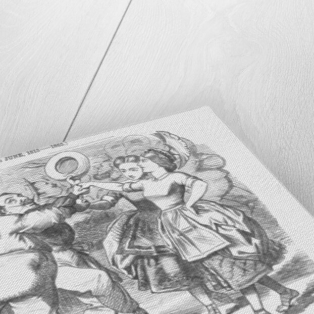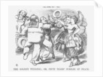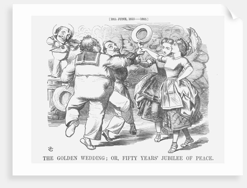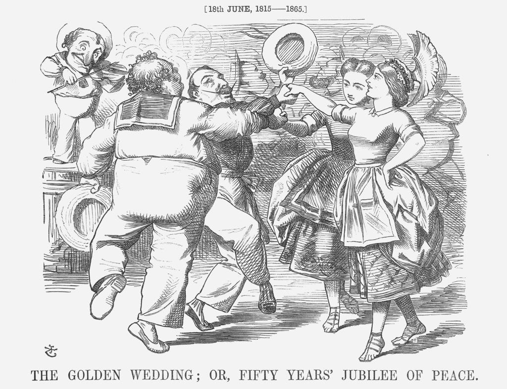 'The Golden Wedding; or, Fifty Years' Jubilee of Peace', 1865. This 'Jubilee' is celebrated by Punch and shows, left to right, John Bull, Napoleon III, France and Britannia, joining hands in a dance with Mr Punch fiddling away in the background. Peace had reigned, although sometimes uneasily, between Britain and France for fifty years. From Punch, or the London Charivari, June 18, 1865.