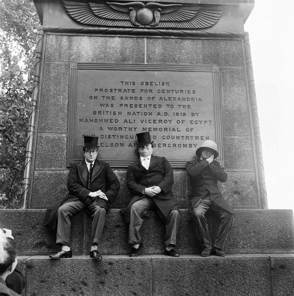 The Goons of BBC fame at Cleopatra's Needle on the Embankment, London. The trip was to get material for their programme 'The Reason Why'. The material they got on why the Needle was discovered was put in a 30 minute radio show. From left to right are Peter Sellers, Harry Secombe and Spike Milligan. 11th August 1957.