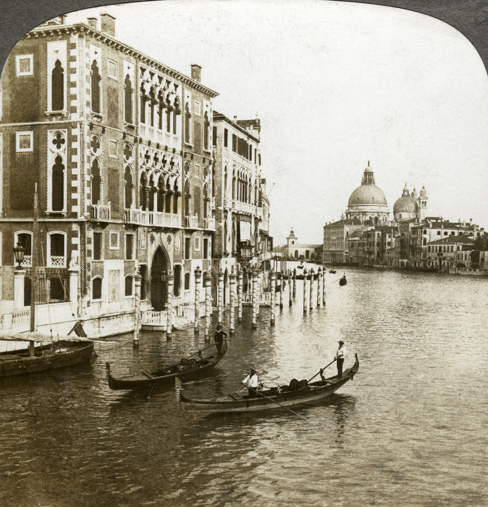 The Grand Canal, Venice, Italy. The 17th century Church of Santa Maria della Salute, designed by Baldassare Longhena, is in the background. Stereoscopic card detail.