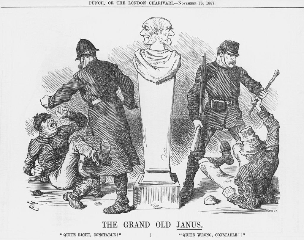 'The Grand Old Janus', 1887. Gladstone is the statue of Janus, the Roman god of doorways. Janus is usually depicted with two faces looking in different directions. Janus approves the scene to the left in which a British policeman hands out summary justice to a ruffian. He disapproves of the scene to the right in which an armed officer, dressed in the style of the French police, deals with a similar ruffian. Even as early as the late Victorian period, the debate was being opened on whether or not British policemen should be armed. The view that it would only lead to the criminals arming themselves also is evidenced by the ruffian on the right having armed himself with a club. From Punch, or the London Charivari, November 26, 1887.