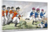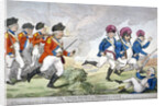 'The grand review on Sydenham Common ...', 1792. Dressed in military uniform, King George III, followed by William Pitt the Younger, Edmund Burke and others, is chasing the Prince of Wales, Charles James Fox and Lord Stanhope. Richard Brinsley Sheridan, also in retreat, has fallen and is lying on his back.