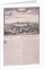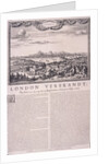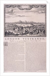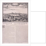 Panoramic view of London, above, showing a group of figures and dogs in the foreground watching the Great Fire of London in 1666. The lower section contains Dutch text.