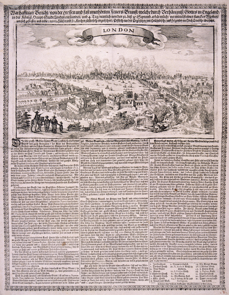 Upper section shows a panoramic view of London with the Great Fire of London burning in the distance, 1666; lower section contains text.