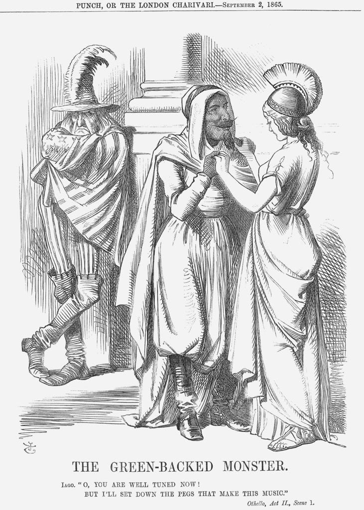 'The Green-Backed Monster', 1865. Iago exclaims O, You are Well Tuned Now! But I'll set Down the Pegs that Make this Music., from Othelllo. Napoleon III courting a blushing Britannia, whilst a sullen America looks on in the background. At the end of August 1865, the French Fleet visited Portsmouth and were courteously and hospitably entertained. From Punch, or the London Charivari, September 2, 1865.