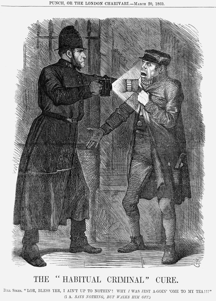 'The Habitual Criminal Cure', 1869. This cartoon refers to what might be called an early 'stop and search'. Recently, the Habitual Criminals Act passed through the House of Lords. The Act was designed to allow for the suppression of crime by 'old offenders' and authorised their summary apprehension upon any suspicion that they may be intending to commit a crime. Punch, ever on the side of law and order, fully approved this measure saying that, if the law were to take full advantage of its authority, then the criminals would face a choice between honesty and emigration. From Punch, or the London Charivari, March 20, 1869.