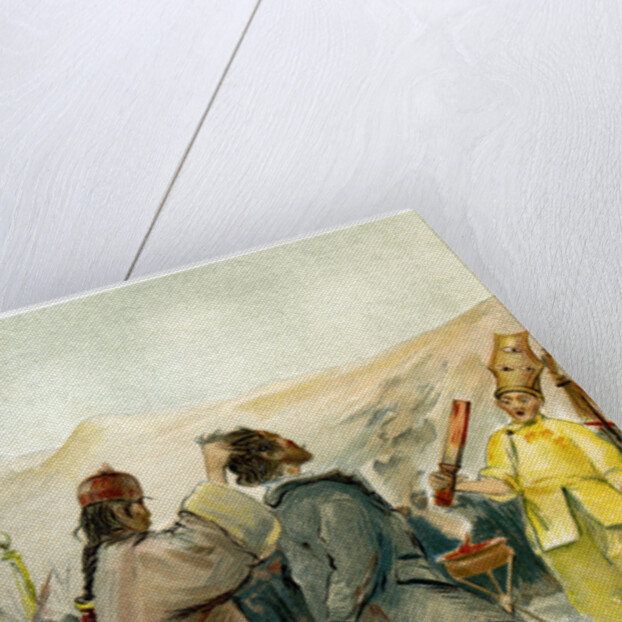 'The hot iron torture', 1898. Plate taken from In The Forbidden Land (an account of a journey in Tibet, capture by the Tibetan authorities, imprisonment, torture, and ultimate release), volume II, by Arnold Henry Savage Landor, published by William Heinemann (London, 1898).