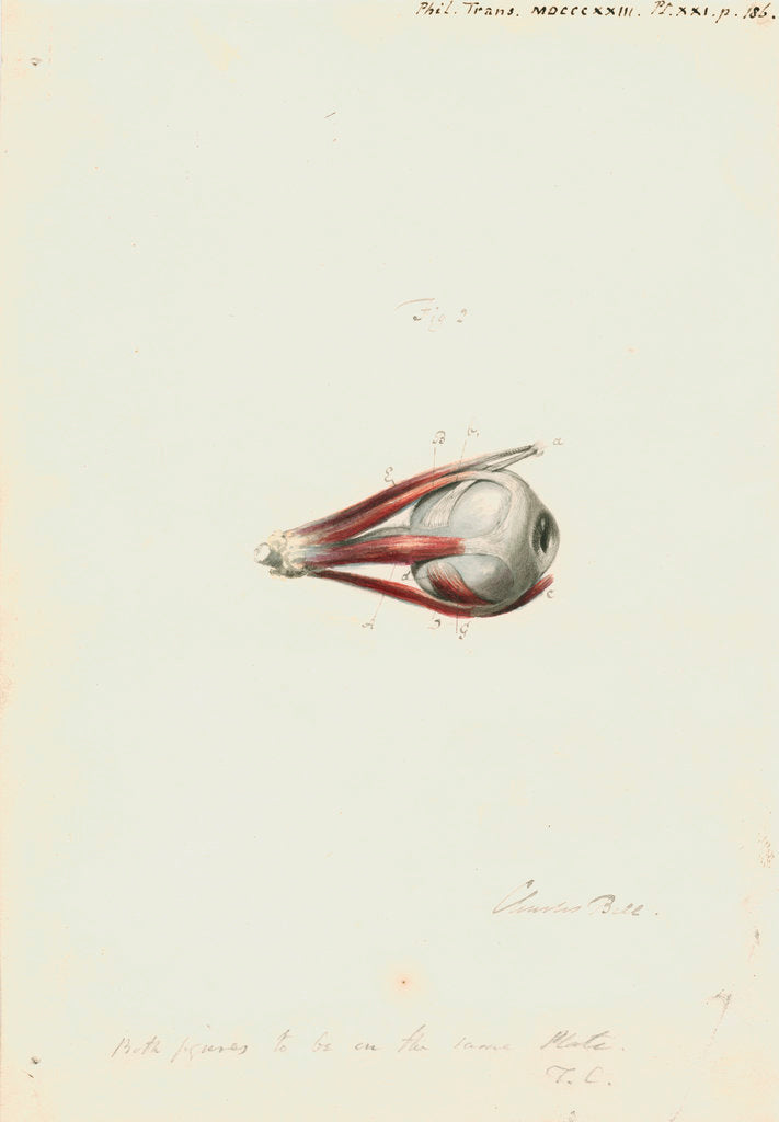 Plate 21 figure 2 from the paper 'On the motions of the eye, in illustration of the uses of the muscles and nerves of the orbit', by Charles Bell, Philosophical Transactions of the Royal Society, vol.113 (1823), pp.166-186. View of the eyeball and its muscles seen in profile, the eye 'looking' to the right. Signed in ink lower right 'Charles Bell.' Royal Society stamp verso.