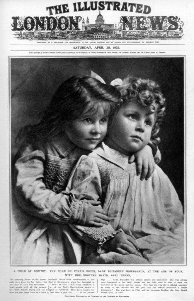 The Illustrated London News, 28th April 1923. Lady Elizabeth Bowes-Lyon, at the age of four, with her brother David, aged three. Elizabeth Bowes-Lyon married the Duke of York (the future King George VI) on 26th April 1923.