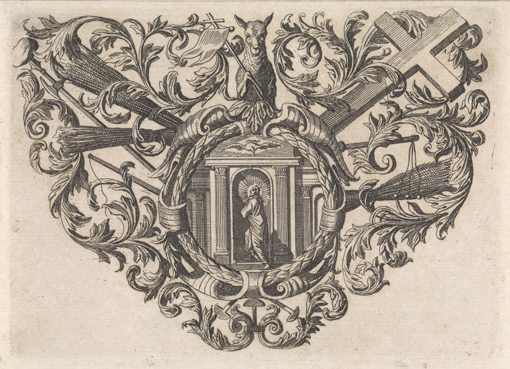 The image of Christ is contained in an ornamental frame with floral motifs and Christian symbols, print maker: Caspar Luyken, Dating 1705