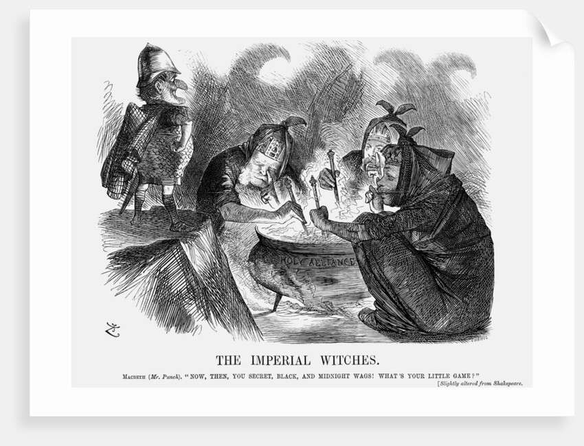 'The Imperial Witches', 1872. Mr Punch plays Macbeth to the three witches who represent the Emperors of Germany, Austria and Russia. This cartoon relates to a conference that took place in Berlin on 7th September 1872. The conference was celebrated with military display and other festivities. The question that Punch is asking is what lay behind this meeting. From Punch, or the London Charivari, September 7, 1872.