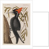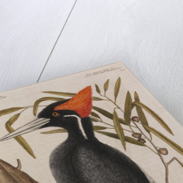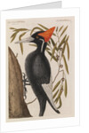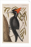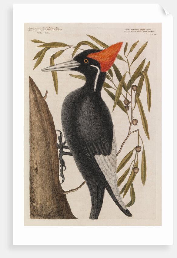 'Picus maximus rostro albo', the largest white-bill wood-pecker, perched on the trunk of 'Quercus anpotius', the willow oak (Catesby's identifications; modern scientific names: Campephilus principalis, the ivory-billed woodpecker; Quercus phellos, the willow oak). This bird species is now listed as 'definitely or probably extinct' by the American Birding Association. Plate 16 from volume I of The natural history of Carolina, Florida and the Bahama Islands, by Mark Catesby (London, 1731). Mark Catesby was elected a Fellow of the Royal Society in 1733.