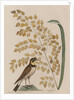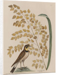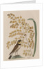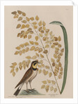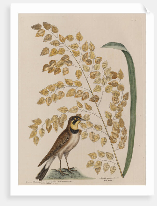 Alauda gutture flavo', the lark, and 'Gramen myloicophoron oxyphyllon carolinianum', the sea-side oat (Catesby's identifications; modern scientific names: Eremophila alpestris, the horned lark; Uniola paniculata, the sea-oat). Plate 32 from volume I of The natural history of Carolina, Florida and the Bahama Islands by Mark Catesby (London, 1731). Mark Catesby was elected a Fellow of the Royal Society in 1733.