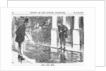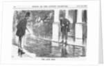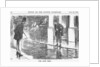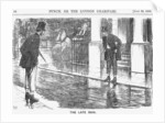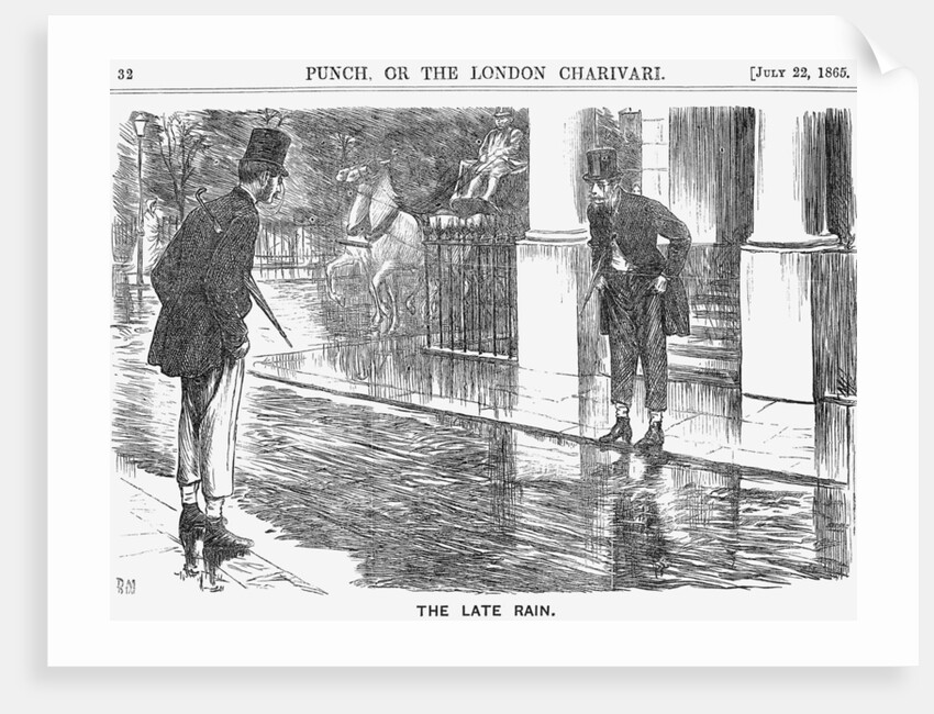 'The Late Rain', 1865. Two gentlemen hitch their trousers up before attempting to cross the road. Many of London's streets remained unpaved at this time. In addition, a lack of gutters and the dirt of man and horse tended to compound the problem. In wet weather, the roads could become almost impassable, as shown in this cartoon. From Punch, or the London Charivari, July 22, 1865.