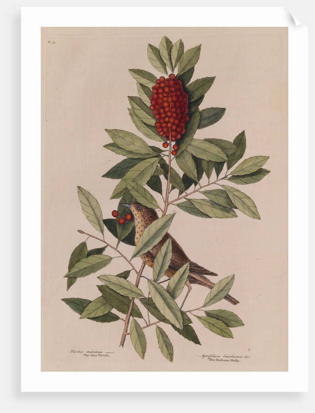 'Turdus minimus', the little thrush, and 'Agrifolium carolinense folijs dentatis baccis rubris', the dahoon holly (Catesby's identifications; modern scientific names: Catharus guttatus, the hermit thrush; Ilex cassine, the dahoon). Plate 31 from volume I of The natural history of Carolina, Florida and the Bahama Islands by Mark Catesby (London, 1731). Mark Catesby was elected a Fellow of the Royal Society in 1733.