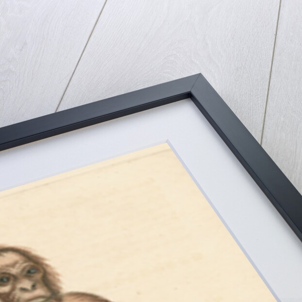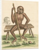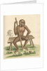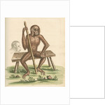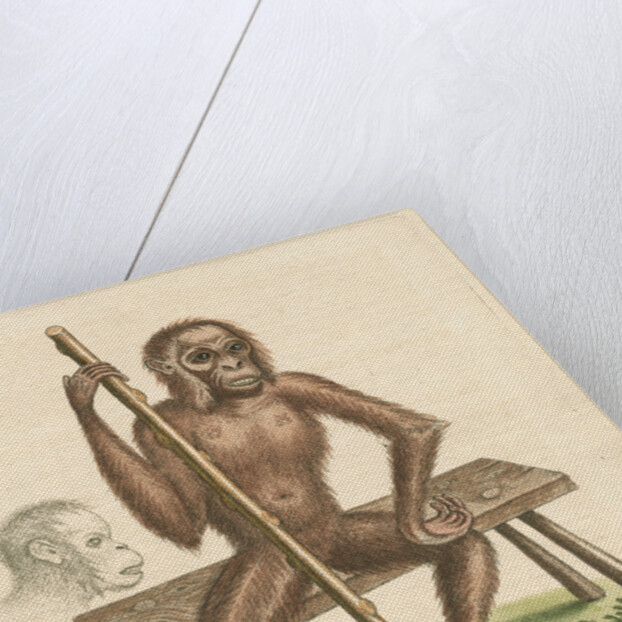Zoological study of the Orangutan, posed seated on a wooden bench and holding a staff. With a profile detail of the great ape's head. Plate 213 from chapter 3 of Gleanings of natural history, exhibiting figures of quadrupeds, birds, insects, plants, &c..., by George Edwards, volume 1 (London, for the author, 1758). The plate is inscribed: 'Synonymus Names. The Satter, Savage, Wild-man, Pigmy, Orang-autang, Chimp-anzee &c. Geo.Edwards Delin: et Sculp: AD 1757'