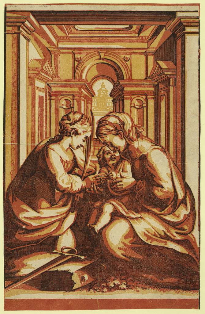 The Marriage of St. Catherine, Artist, Between Ca. 1500 and 1600, Chiaroscuro Woodcut, Print Shows St. Catherine Kneeling Next to the Infant Jesus Seated on His Mother's Lap. Jesus Gives Catherine a Ring.
