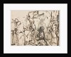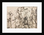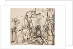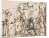 The Meeting of Christ with Martha and Mary after the Death of Lazarus, c. 1662-65. Scholars now consider this drawing a rare, late work by Rembrandt. Here, Christ meets with Martha and Mary after the death of their brother, Lazarus (John 11:30-36). The composed dignity of Christ's face and his calm compassion contrast with the prostrate figure of Mary and the agitated drawing of the kneeling Martha, whose outstretched hands are repeated three times, suggesting a frenzied expressivity. Above Martha, white gouache obliterates the figure of a standing man as well as a first version of Martha's head. The combination of rough power and sublime tenderness that characterizes Rembrandt's late drawing style is here demonstrated in the dramatic rendering of the sisters grief and the sensitive portrayal of the bearded old man who dries his eyes with a kerchief at the right.