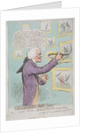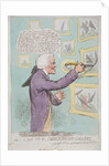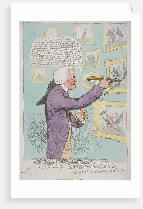 'The Monster broke loose or, a peep into the Shakespeare-Gallery', 1791. Alderman John Boydell, wearing a greedy expression, slashes with a large knife at the pictures in his gallery in Pall Mall; a suggestion was made by malicious persons, when some of the pictures were damaged, that Boydell had done it himself to excite public sympathy.
